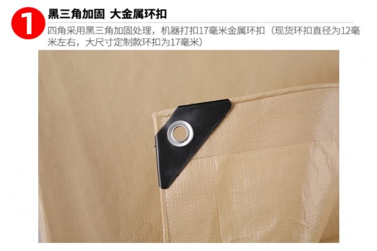 產(chǎn)品介紹肉色PE防水篷布加厚包角,四角采用黑三角加固處理,大金屬環(huán)扣,機(jī)器打扣17mm金屬環(huán)扣。肉色PE防水篷布四邊打孔,默認(rèn)常規(guī)1米一個···